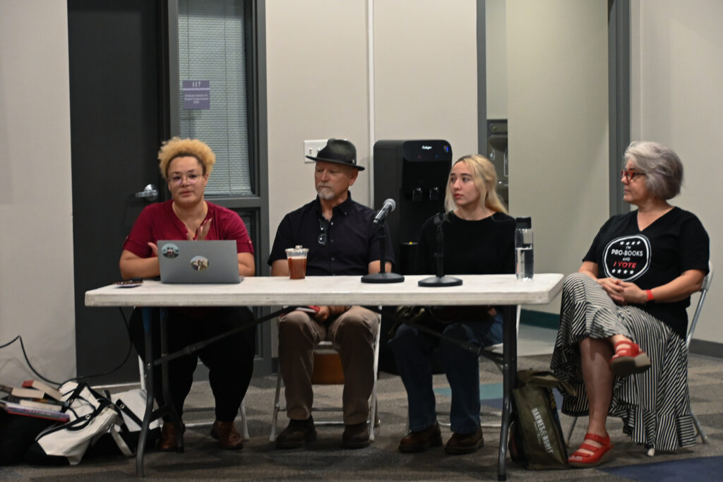 Author Becca Spence Dobias of “On Home” signs a copy for an interested reader at the University of Redlands’ Literary Liberation free book fair outside Hunsaker Lounge on Oct. 10, 2025. “On Home” follows the journey and challenges of three young women from rural Appalachia, and was one of many books available for free at this event honoring Literation Liberation Day. Photo credit: Brianne SparksLiterary Liberation panel members Brittny Cotton, J.D. Mathes II, Alana Poyneer and Heather King (from left to right) lead a discussion on the history and politics of banned books as part of the University of Redlands’ Oct. 10, 2025 Literary Liberation Day inside Hunsaker Lounge. The discussion had active participation from the audience made up of local community members, high school students, UoR students, authors, and journalists. Photo credit: Brianne SparksUniversity of Redlands students peruse books at the Oct. 10, 2025 Literary Liberation free book fair in honor of the University of Redlands Literary Liberation Day outside Hunsaker Lounge. Books for every age range were available on a wide variety of controversial subjects such as sexuality, gender, immigration and culture. Photo credit: Brianne Sparks