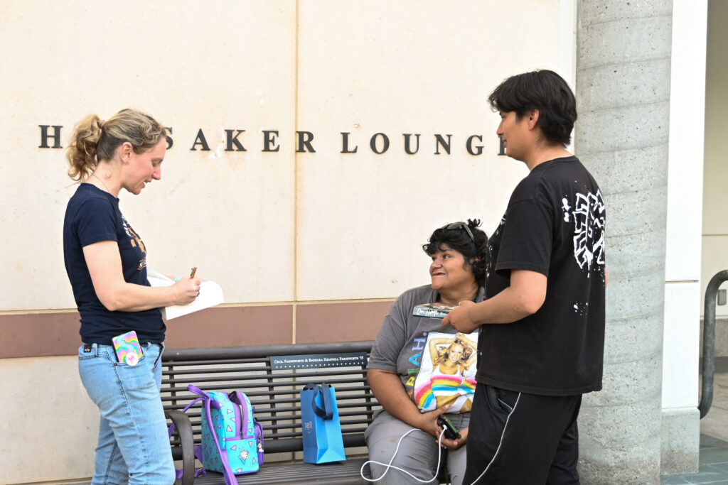 Local high school students talk with a volunteer at the University of Redlands Oct. 10, 2025 Literary Liberation free book fair. Held outside of Hunsaker Center, many Redlands high school and college students came to show support and participate in the Literary Liberation panel. Photo credit: Brianne Sparks