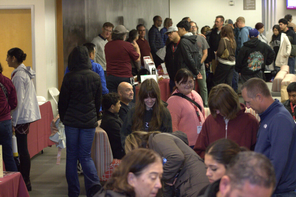 Inside Hunsaker Lounge, many organizations set up booths to show prospective students what options are available for campus involvement. Off screen, warm refreshment of coffee and hot chocolate were provided by Harvest Table. Credit: Jackson Decanio