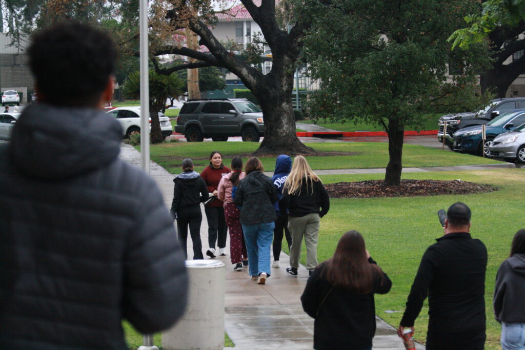 After a general debrief about the University of Redlands, families took a tour around the campus. Many tours were cut short, however, due to inclement weather and substituted with video tours inside Memorial Chapel. Credit: Jackson Decanio